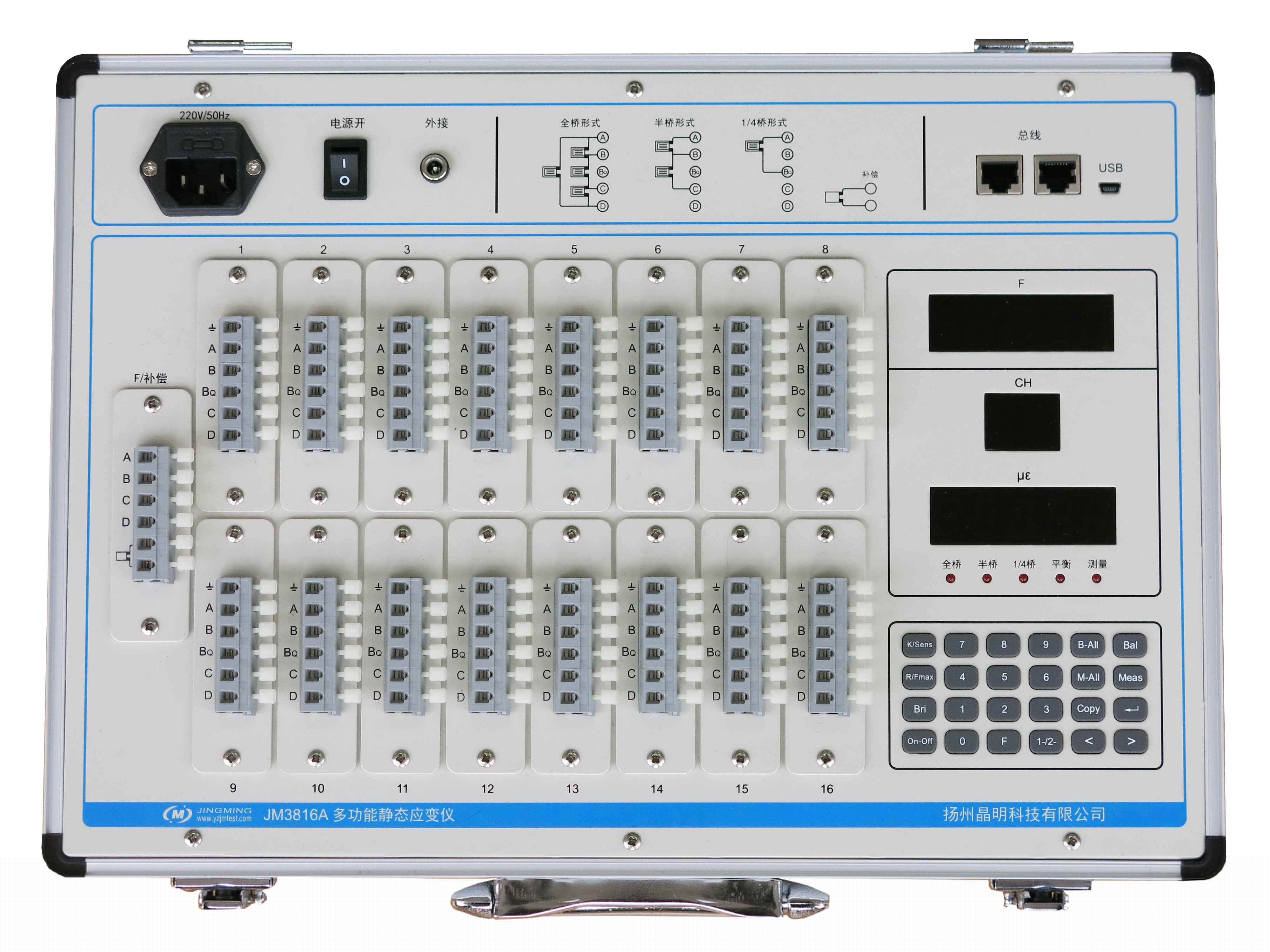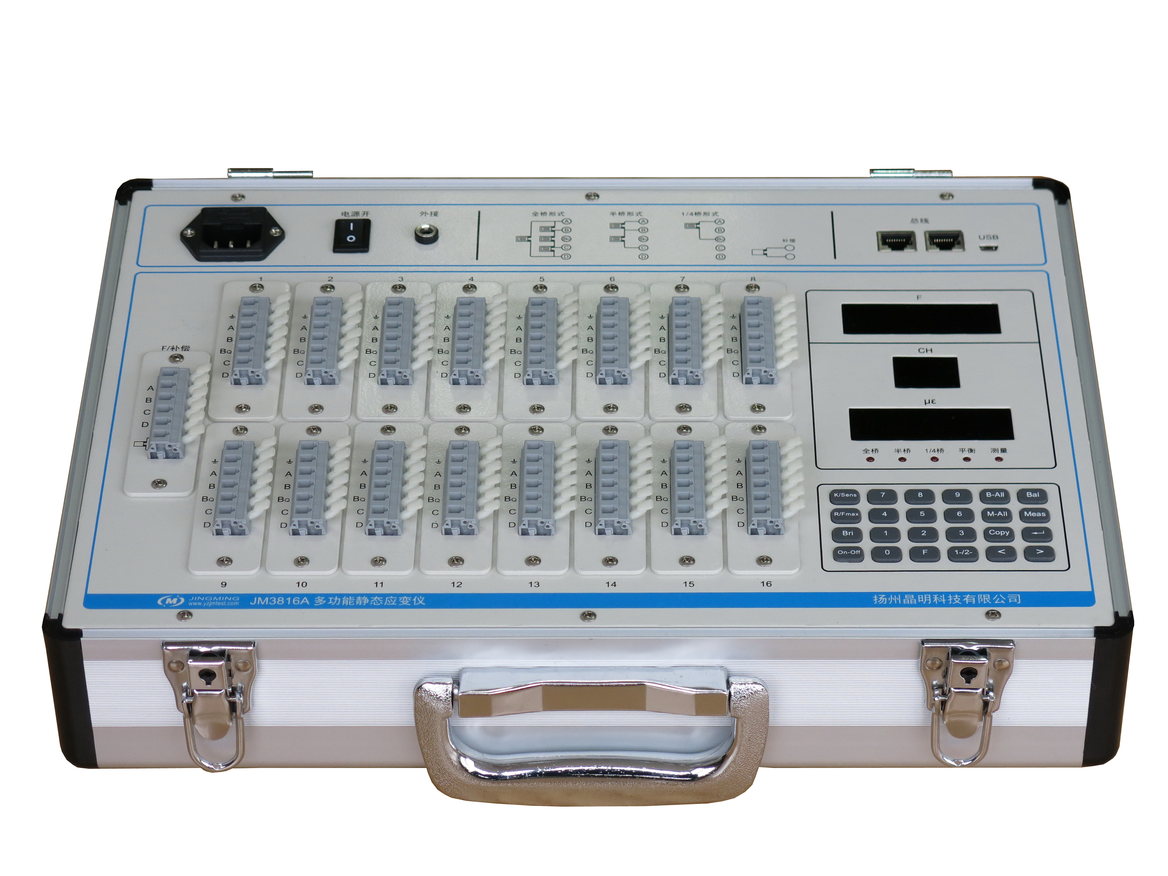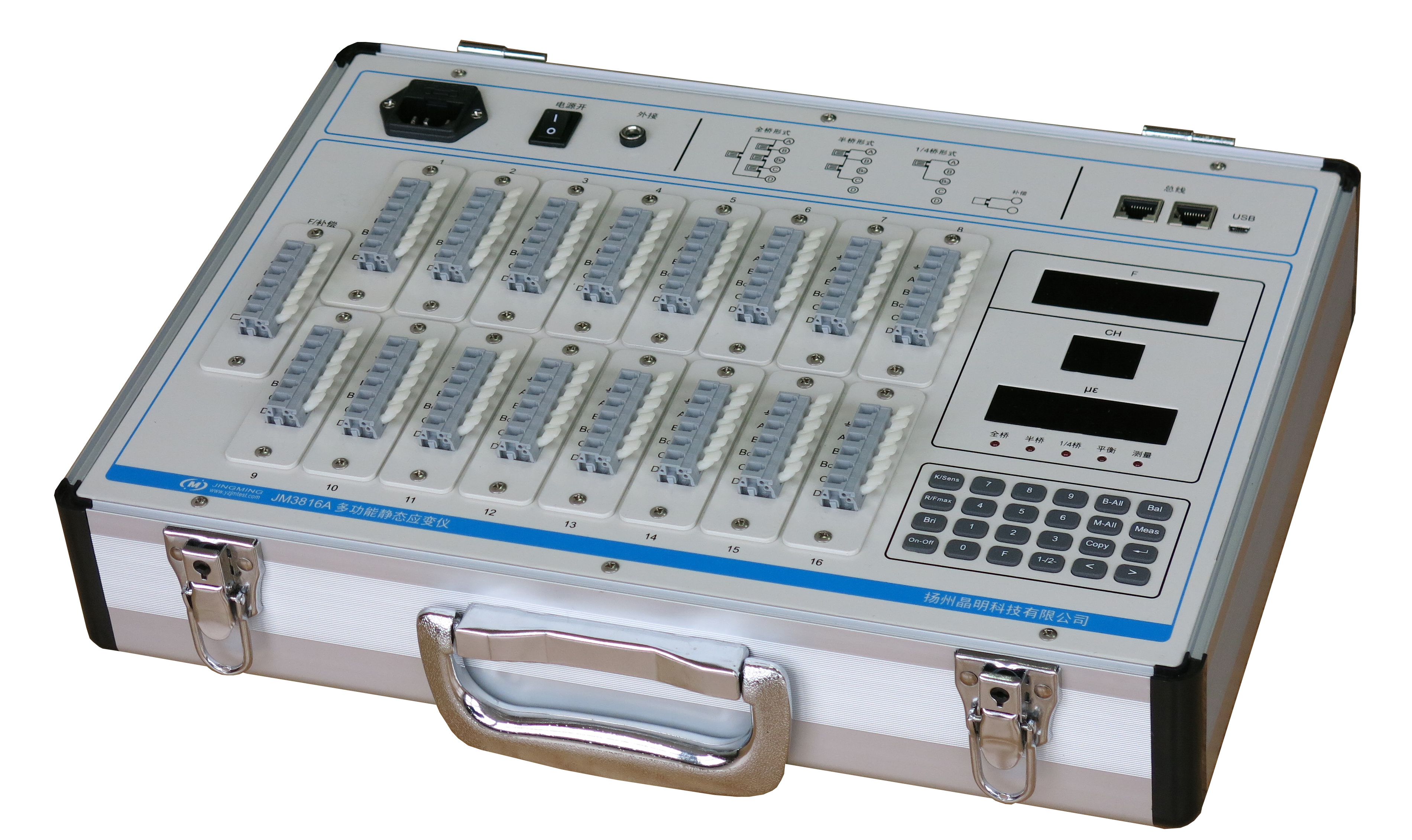JM3816A可脫離計算機直接控制測試顯示,其設(shè)計原理完全類同于我們的工程型采用的第三代應(yīng)變儀的技術(shù),具有總線組網(wǎng)功能,可適用于教學(xué)實驗及小型工程測試,同時也預(yù)留了無線測試的功能??偩€組網(wǎng)功能可方便地將實驗室的設(shè)備進行組網(wǎng),特別適合實驗教學(xué),并可完成學(xué)生實驗數(shù)據(jù)的自動評定。
