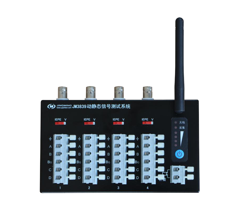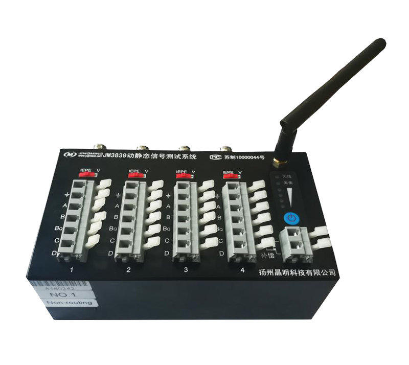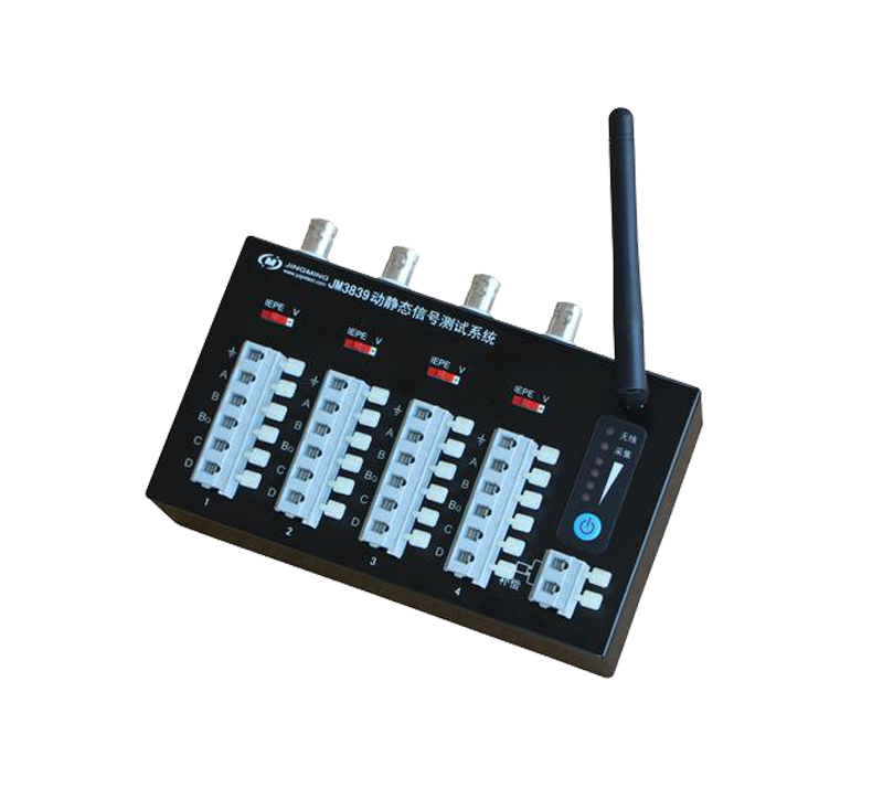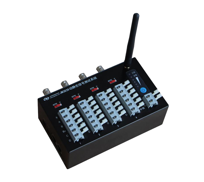 JM3839動(dòng)靜態(tài)信號測試系統(tǒng),4通道/臺,每通道可以用于測應(yīng)變或測振動(dòng)。測振動(dòng)可配接電壓型或壓電式傳感器。儀器支持AC220V供電,也支持外接直流電源(蓄電池)供電,并且直流供電的范圍很寬,使用十分便捷,多臺儀器有線組網(wǎng)(采用易于制作的網(wǎng)線)測試時(shí),可通過外接直流電源(蓄電池)供電線纜集中供電,方便了現(xiàn)場的布線。儀器每個(gè)測點(diǎn)橋路獨(dú)立設(shè)置,每臺儀器有一個(gè)補(bǔ)償片接入端子,可在軟件中分別為每個(gè)測點(diǎn)選擇補(bǔ)償片,現(xiàn)場測試方式更加靈活。每個(gè)測點(diǎn)有一個(gè)BNC輸入端子,設(shè)置為電壓輸入時(shí)可以直接連接如拾振器的電壓輸出型傳感器,設(shè)置為IEPE時(shí)可以直接配接IEPE傳感器。儀器每個(gè)通道采用獨(dú)立24bits ADC,具有較高的信噪比,保證每個(gè)通道同步采集,多臺儀器組網(wǎng)時(shí)也能保證所有通道的同步性。