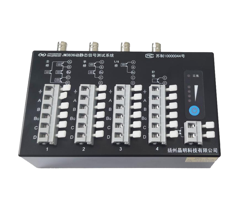 JM3836動靜態(tài)信號測試系統(tǒng),4通道/臺,每通道可以用于測應(yīng)變或測振動。測振動可配接電壓輸出型傳感器(拾振器)。儀器支持AC220V供電,也支持外接直流電源(蓄電池)供電,并且直流供電的范圍很寬,使用十分便捷,多臺儀器有線組網(wǎng)(采用易于制作的網(wǎng)線)測試時,可通過外接直流電源(蓄電池)供電線纜集中供電,方便了現(xiàn)場的布線。儀器每個測點橋路獨立設(shè)置,每臺儀器有一個補償片接入端子,可在軟件中分別為每個測點選擇補償片,現(xiàn)場測試方式更加靈活。每個測點有一個BNC輸入端子,設(shè)置為電壓輸入時可以直接連接如拾振器的電壓輸出型傳感器。儀器每個通道采用獨立24bits ADC,具有較高的信噪比,保證每個通道同步采集,多臺儀器組網(wǎng)時也能保證所有通道的同步性。