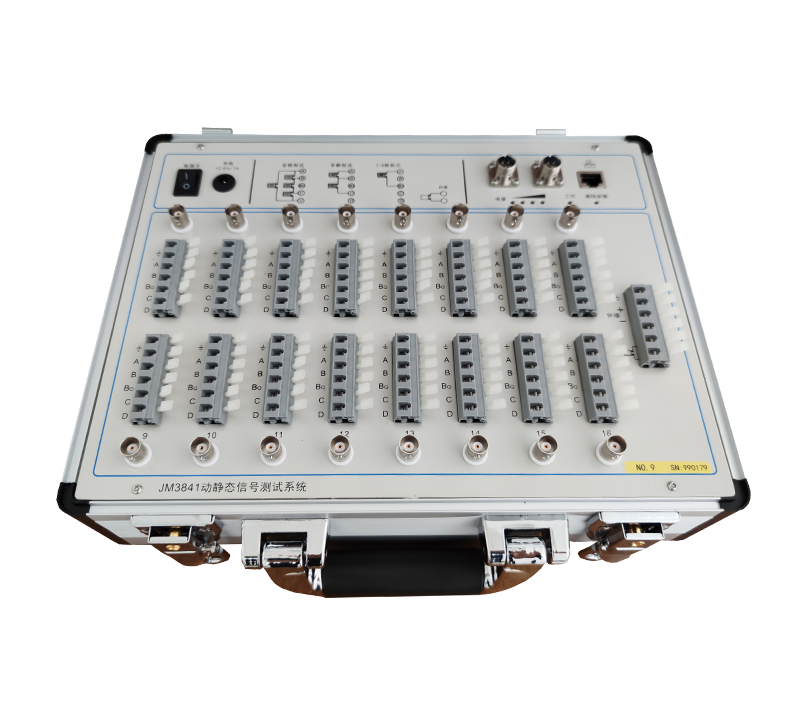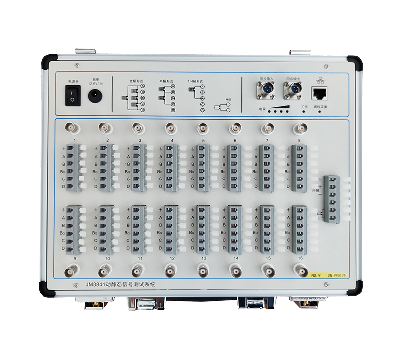 JM3840/JM3841動靜態(tài)信號測試系統(tǒng)是一款支持靜態(tài)和低速動態(tài)應(yīng)變、電壓、IEPE測試的高性能測試系統(tǒng),特別適合測點(diǎn)分布相對分散的工程測試場合,所有測點(diǎn)同步進(jìn)行采集。系統(tǒng)支持以太網(wǎng)組網(wǎng)測試。儀器內(nèi)置鋰電池工作,也支持外接直流電源(蓄電池)供電,并且直流供電的范圍很寬,使用十分便捷。儀器每個測點(diǎn)橋路獨(dú)立設(shè)置,每臺儀器有一個補(bǔ)償片接入端子,可在軟件中分別為每個測點(diǎn)選擇補(bǔ)償片,現(xiàn)場測試方式更加靈活。每個測點(diǎn)設(shè)有應(yīng)變接線端子和BNC輸入端子,可接應(yīng)變片、拾振器、IEPE型傳感器、各種橋式傳感器,可以測量應(yīng)力應(yīng)變、加速度、溫度、力等信號,廣泛應(yīng)用于橋梁、建筑的檢測試驗(yàn)和疲勞試驗(yàn)現(xiàn)場。端子設(shè)置為電壓輸入時可以直接連接如拾振器的電壓輸出型傳感器,設(shè)置為IEPE時可以直接配接IEPE傳感器。儀器每個通道采用獨(dú)立24bits ADC,具有較高的信噪比,保證每個通道同步采集,多臺儀器組網(wǎng)時通過連接同步線也能保證所有通道的同步性。